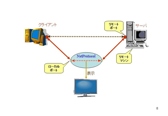 - NetProtocol はクライアントからの通信を リモートマシンのリモートポートに中継し,同時に内容をディスプレイに表示する