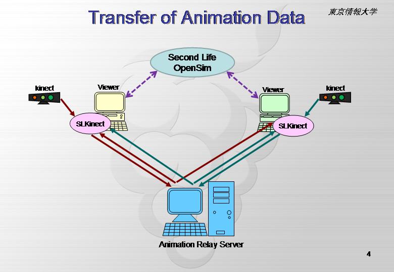 - SLKinect2 は Kinect で読み込んだデータをネットワーク越しに Second Life/OpenSim の Viewerに転送し,リアルタイムにアバターを動かすことが可能です.