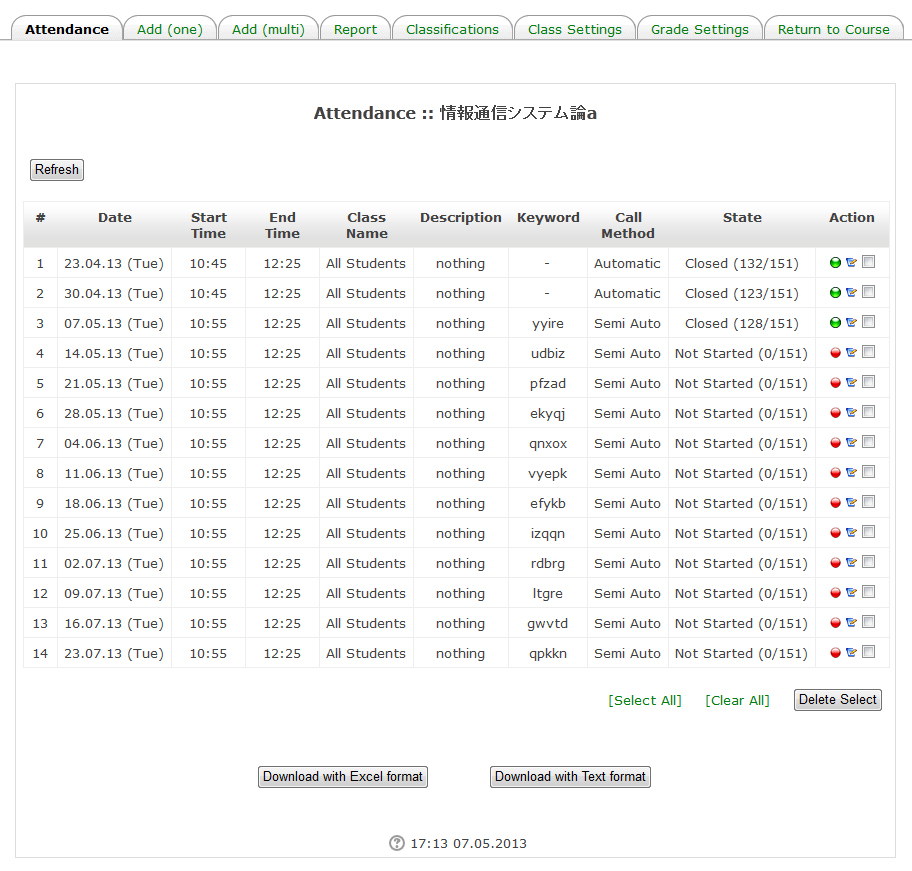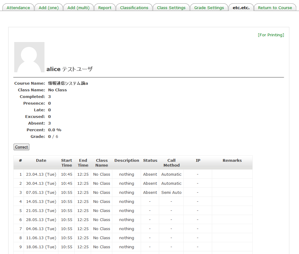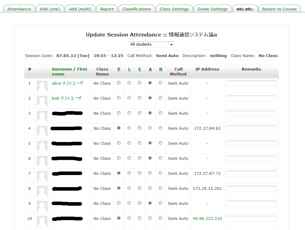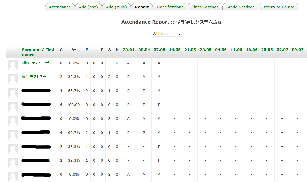 In addition to the manual attendance mode to take attendance manually the original, automatic attendance mode (from the access log of Moodle) and semi-automatic attendance mode (user clicks a link) are also possible.